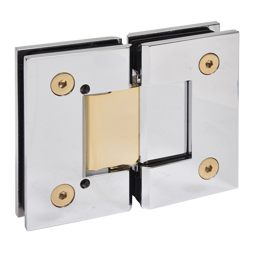 The Adjustable Designer 180° Glass-to-Glass Hinge has taken our popular Designer Hinge to a new level. Adjustment to accommodate the desired angle (up to 30º) is done after the door is installed. Once the door is hung, simply loosen the Allen set screws and turn the door to the desired closed position. By merely tightening the Allen screws your door will self-center to the desired closing position. The door can swing 30º inward and 30º outward (adjusting angle from factory set position will reduce 30º swing in that direction).